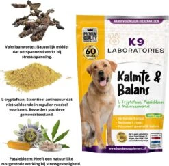 K9 Laboratories Kalmte & Balans – Hond – 60 Stuks – Bij Stress, Angst En Agressie – Ashwagandha – L-tryptofaan – Passiebloem – Valeriaanwortel – Lavendel