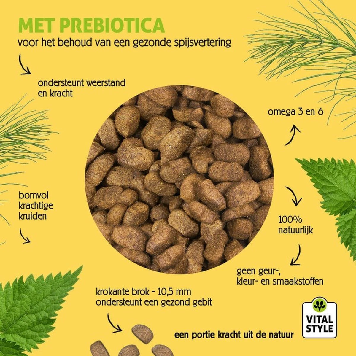 Vlees en dierlijke bijproducten (rund, varken, lam), tarwe, gevogelte, maïs, dierlijk eiwitextract, Kruidenmix waaronder: Brandnetel 0,1%, Mariadistel 0,1%, Heermoes 0,3% en Sint-janskruid 0,03%, rijstzemelen, gerst, tarwegries, zonnebloemolie, bietenpulp, geëxtraheerde sojabonen (getoast), dierlijk vet (gevogelte), gist, visolie (zalm), inuline (bron van FOS, 0,34), lijnzaadolie.